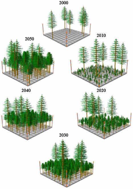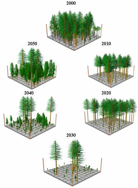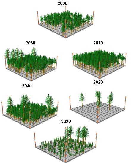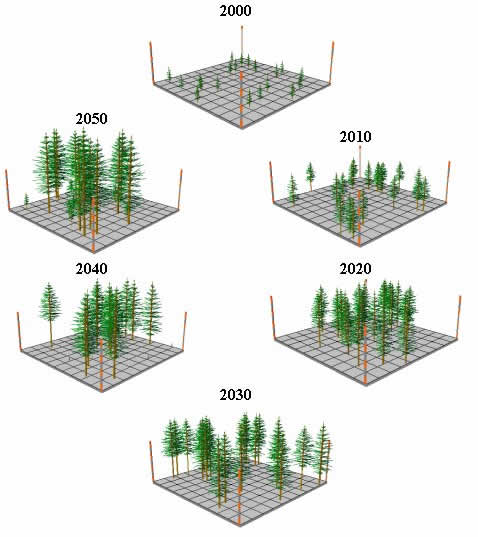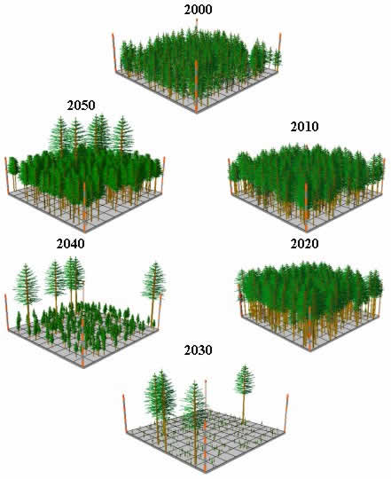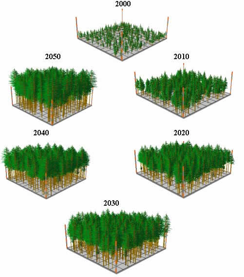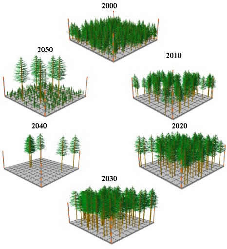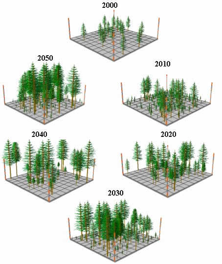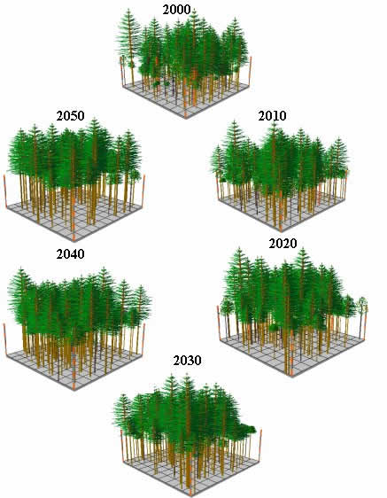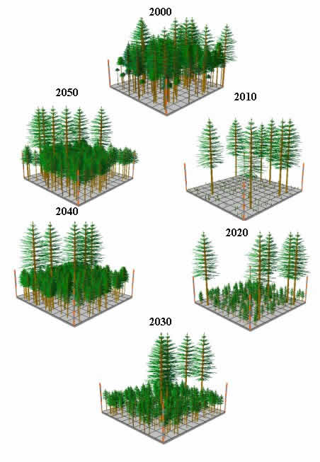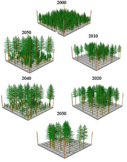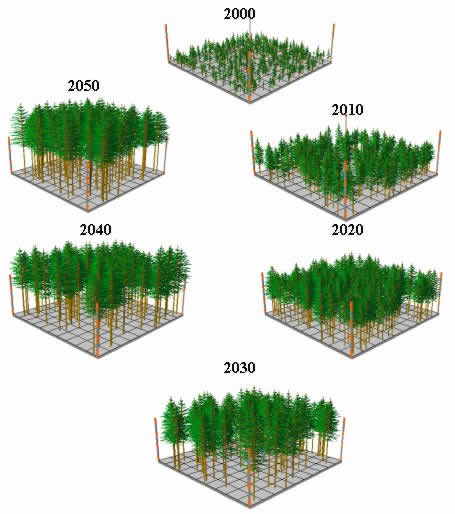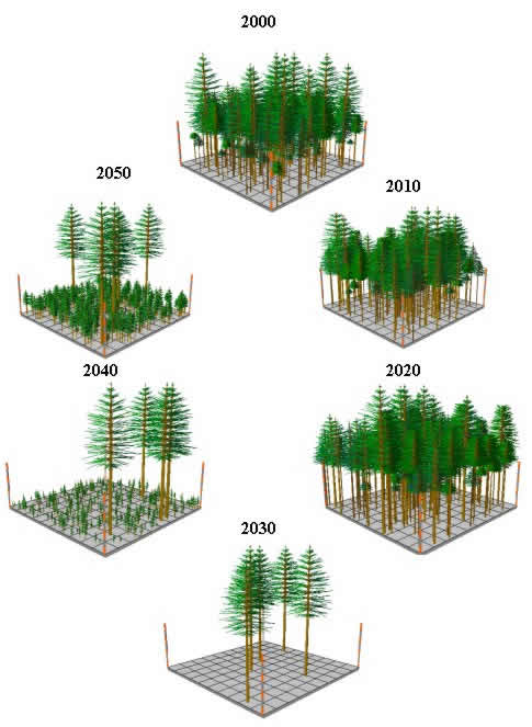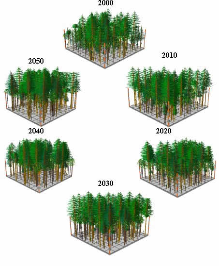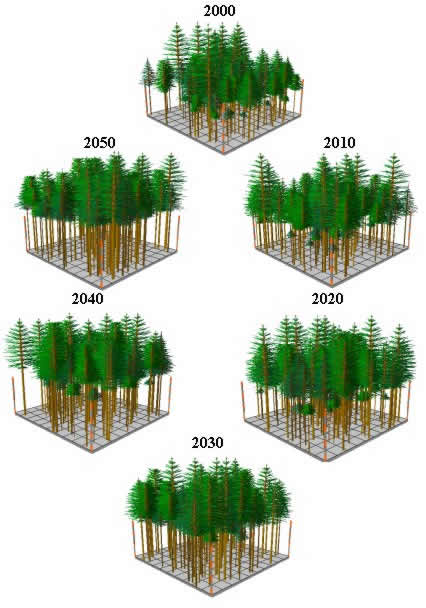 Group 3 Pathway: Path1 - In (2005) the stand was thinned to 50 trees per acre. In (2025) the stand was thinned to 20 trees per acre and 200 douglas-fir trees were planted. In (2030) a weeding treatment was implemented.