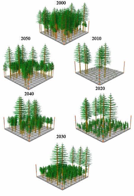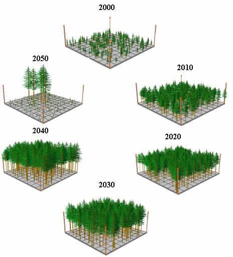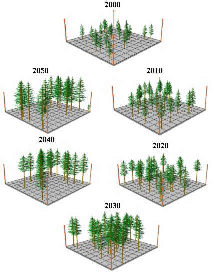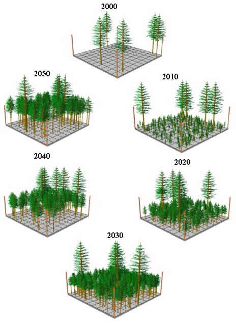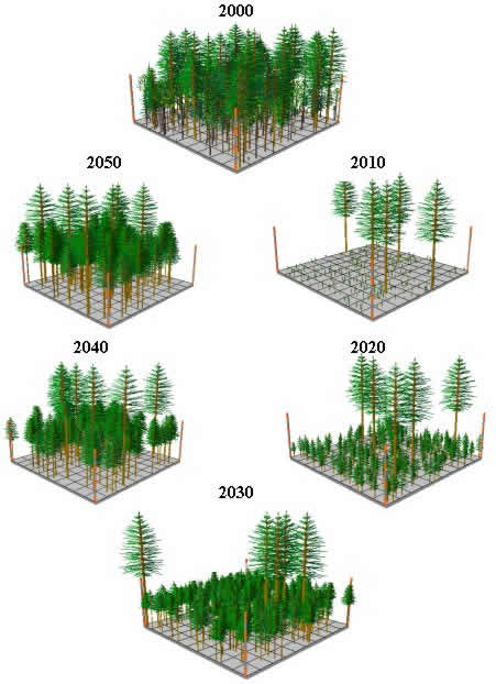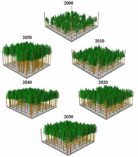 Group1 Pathway: Path10 - In (2000) a weeding treatment was implemented. In (2005), the stand was thinned to 200 trees per acre. In (2025) the stand was thinned to 150 trees per acres. Finally, in (2045) the stand was thinned to 5 trees per acres and 300 trees per acres was planted.