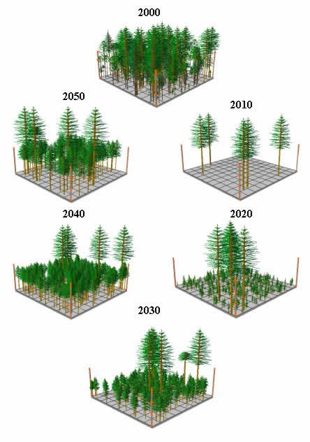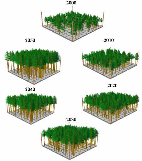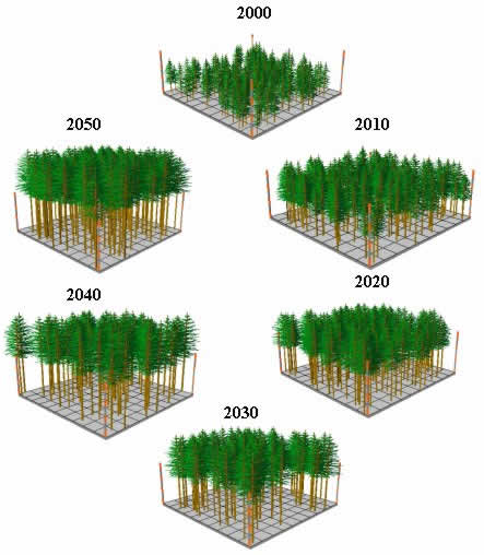 Group 3 Pathway: Path13 -In (2000) a weeding treatment was implemented; the stand was thinned to 15 trees per acre; the stand was pruned20, and the stand was planted with a mixture of 80 trees per acre. In (2020) the stand is thinned from below to 60 tpa and then the whole stand is thinned proportionally to 35 tpa and planted with 80 tpa. This sequence is again followed in (2040).