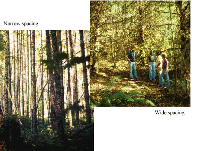 When trees are grown at narrow spacing, they often slow in diameter before they are large enough to be thinned for profit.The diameter of the tree at the time diameter growth slows is quite predictable. For example, in Douglas-fir trees planted at 8 X 8 foot spacing (680 trees/acre) diameter growth slows dramatically when the average tree is ~8 inches DBH. Douglas-firs planted at 12 X12 foot spacing (300 trees/acre) slow at about 11 inches DBH (Oliver et al. 1986). If an investment is not made to precommercially thin the stand, the trees may grow more in height, but not diameter, which makes the trees increasingly unstable (Figure 17, left). Eventually the stand will stagnate and the trees will bend or blow over in winds or wet snows. Planting trees at wide spacings avoids the costs of precommercial thinning and delays the danger of stagnation, but can create very large branches that devalue the tree for timber (Figure 17, right). Pruning trees can also avoid the large branches; however, pruning many trees at narrow spacings is expensive and does not allow the pruned trees to grow rapidly in diameter (Figure 18, left). Pruning fewer trees at wide spacings costs less and allows the pruned trees to grow clear wood rapidly (Figure 18, right).