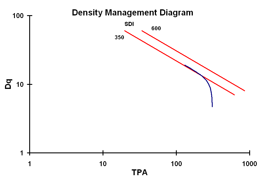 Tabular outputs from LMS can easily be converted to charts with Excel. The example above creates is a density management diagram for Douglas-fir created from the summary table. Click on the image above for a larger image. |