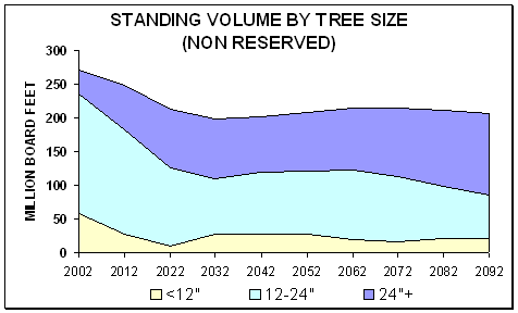 The above chart shows the amount and proportion of standing volume by tree size over time. This chart was extracted from the Toggle companion spreadsheet. Click on the image for a larger image. |