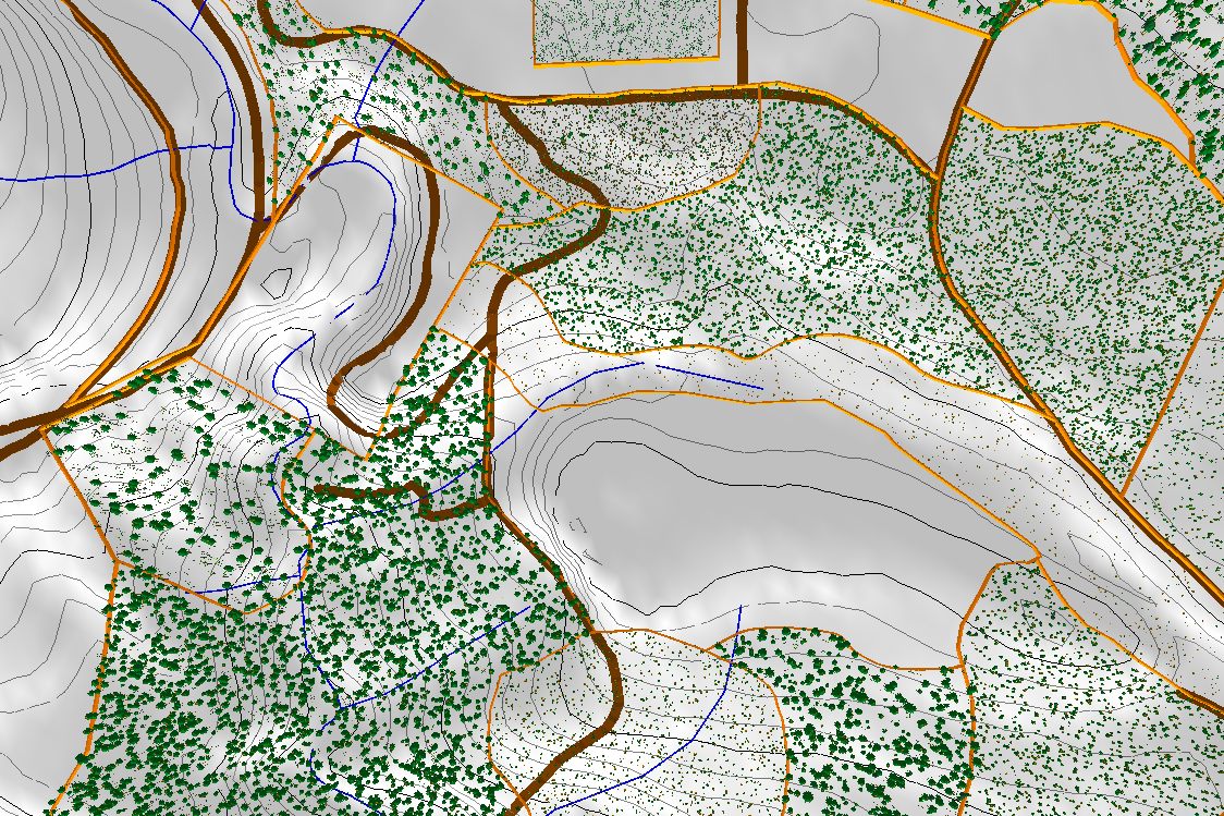 Envision displays trees on the ground service by combining inventory information, elevation information, and a stand boundary map. In addition Envision can also display other spatial features using overlays to indicate the position of those features. The above example shows roads (brown), streams (blue), and stand boundaries (orange). Click on the image for a larger image. |