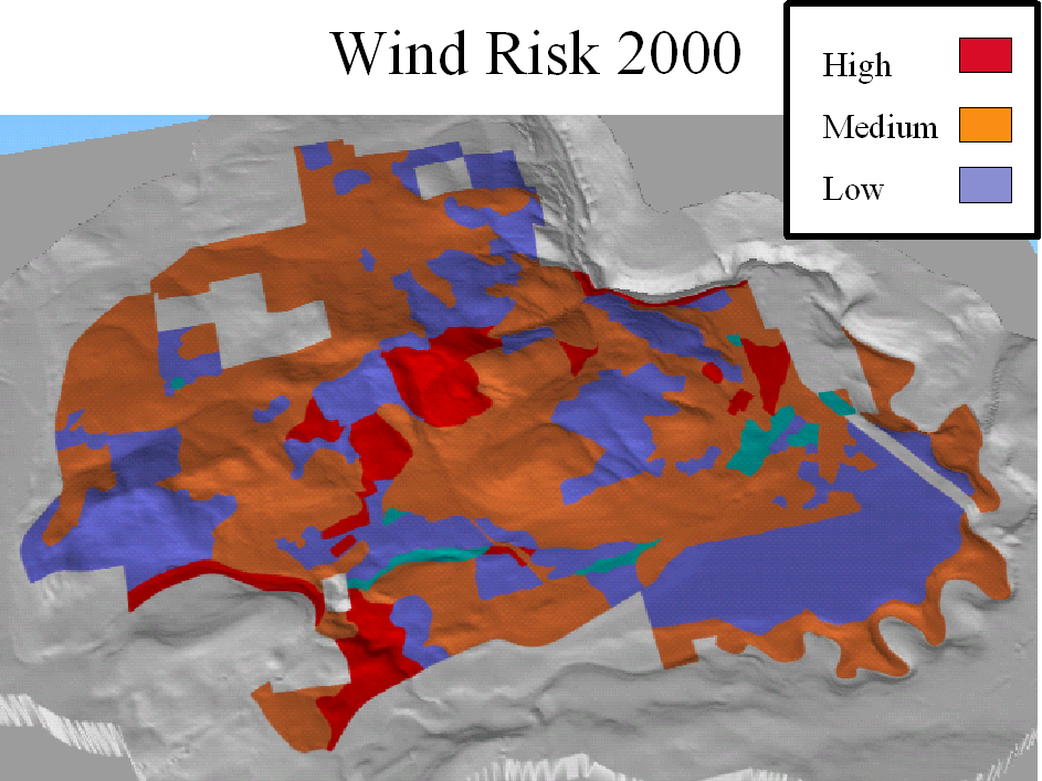 The image to the left combines the use of LMS, Envision and ArcView to create a map of wind risk potential on Pack Forest for a proposed management scenario. |