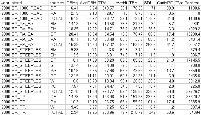 Example summary table displayed in Excel. The summary table contains typical stand level summary statistics for each stand by species. Click on the table above to view a larger image. |